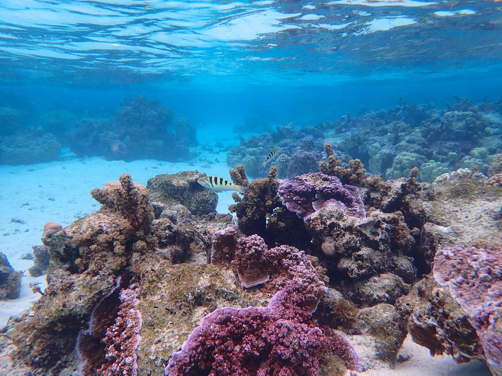 Captain’Mo nous emmène digérer à l’autre bout du motu dans un jardin préservé et méconnu, loin des tours organisés. Plus minéral que celui de Tahaa, il est tout aussi beau si ce n’est plus. Variété de couleurs, de profondeurs, d’espèces… Les coraux prennent ici toutes les nuances de rose, de jaune et de violets, les bénitiers fleurissent partout, les poissons évoluent sans crainte. On y traine longuement, éblouis par ce décor que l’on observe pour la dernière fois.
