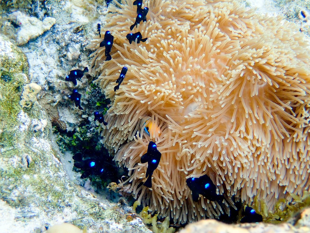 On jette l’ancre au large du Conrad, entre deux autres bateaux, pour faire un petit coucou aux requins pointes noires qui s’agitent au milieu de quelques raies et poissons colorés, malheureusement un peu excités par de mauvais élèves qui leur jettent du poisson.