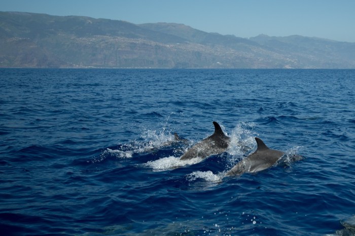 Bien réveillés par cette entrée en matière, on navigue les yeux rivés sur l’horizon à la recherche du moindre signe des dauphins. C’est finalement une jeune tortue de mer qui croisera notre route avec sa jolie carapace aux reflets dorés. Deux dauphins apparaissent finalement au loin puis une première colonie qui navigue entre deux bateaux. On reste peu car notre guide les trouve étonnamment agités ce jour-là. Il nous entraine alors droit vers l’est pour un festival incroyable. Au bout d’un quart d’heure, un premier dauphin vient faire un bon tout prêt du bateau ; il est bientôt rejoint par un, puis deux, puis des dizaines de congénères qui jouent avec les remous créés par le zodiac. C’est tout une famille qui s’agite autour de nous. D’imposants mâles glissent sur les vagues tandis que des femelles plus fluettes montrent la voie à leurs petits. Le moment est magique et d’immenses sourires parcourent le visage de tous ces marins d’un jour. Le bateau ralentit pour nous laisser l’occasion de nous étendre à l’avant, le nez par-dessus bords, éclaboussé par les rebonds des dauphins. Installés ainsi au plus près de ces acrobates, on croirait avoir 10 ans. A bien y repenser, il n’y avait sans doute pas de plus belle façon de quitter Madère.