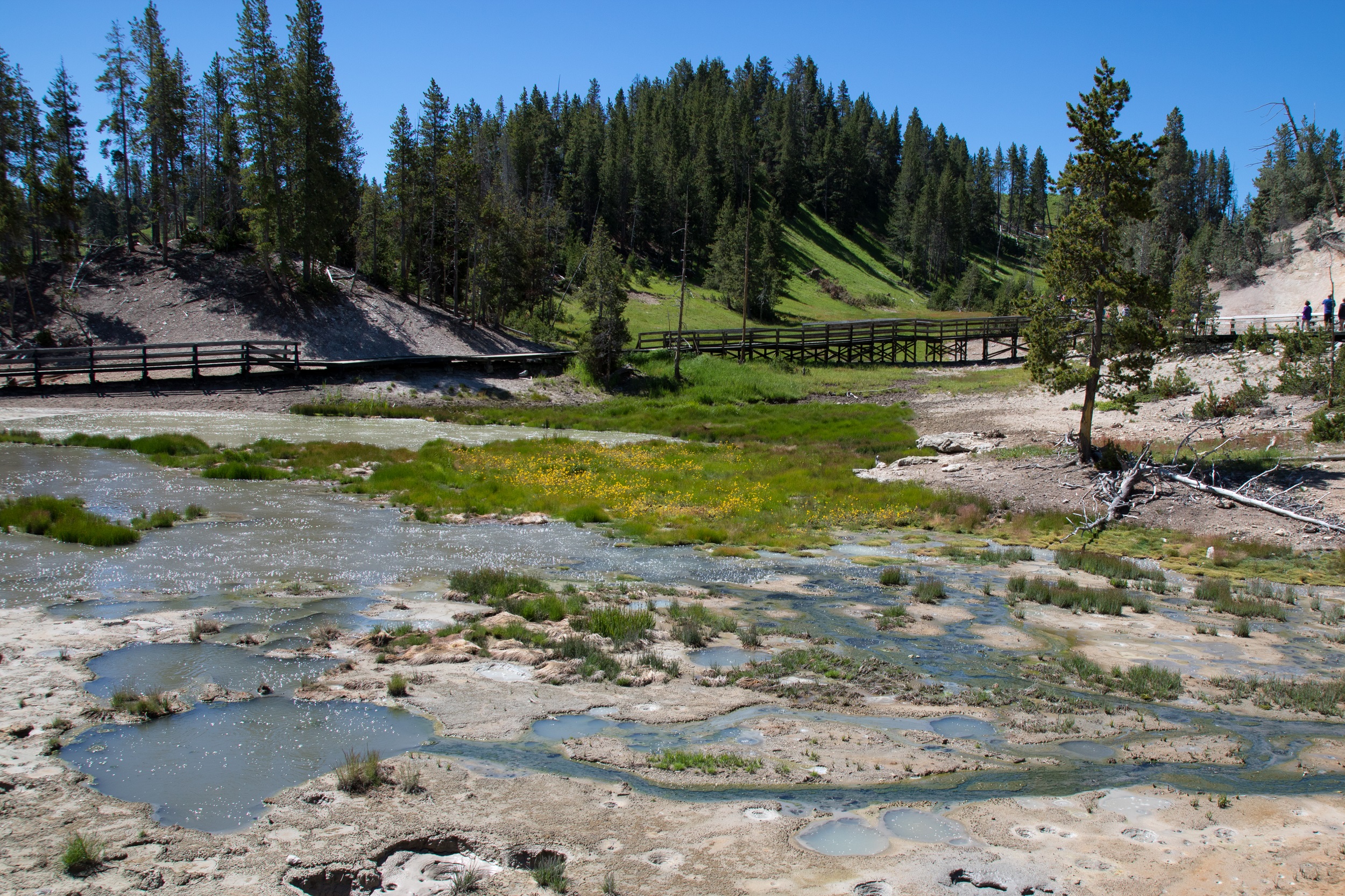 Le cours d’eau est bordé d’herbes vertes et hautes, parsemées de fleurs jaunes. Il court entre des roches de toutes tailles et de toutes formes, partagées entre les nuances de roses et de gris. Ici, impossible de se perdre: il suffit de remonter le lit de la petite rivière sur des kilomètres. Si la randonnée n’a rien de vraiment difficile, elle n’est pas pour autant particulièrement reposante: on passe régulièrement d’une rive à l’autre en escaladant chaque fois de nouvelles pierres ou en s’aventurant dans les herbes hautes. On croise à nouveau le petit groupe de randonneurs puis plus rien. Nous sommes seuls au monde au cœur de Zion.