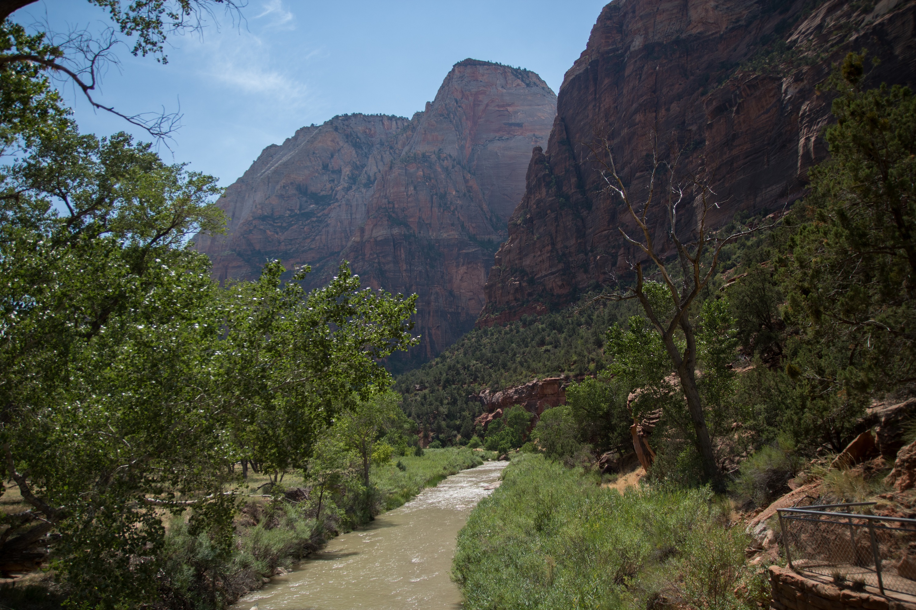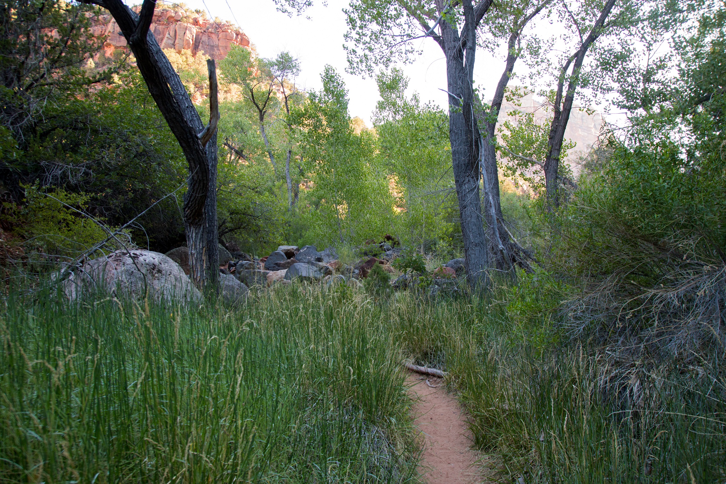 Le cours d’eau est bordé d’herbes vertes et hautes, parsemées de fleurs jaunes. Il court entre des roches de toutes tailles et de toutes formes, partagées entre les nuances de roses et de gris. Ici, impossible de se perdre: il suffit de remonter le lit de la petite rivière sur des kilomètres. Si la randonnée n’a rien de vraiment difficile, elle n’est pas pour autant particulièrement reposante: on passe régulièrement d’une rive à l’autre en escaladant chaque fois de nouvelles pierres ou en s’aventurant dans les herbes hautes. On croise à nouveau le petit groupe de randonneurs puis plus rien. Nous sommes seuls au monde au cœur de Zion.