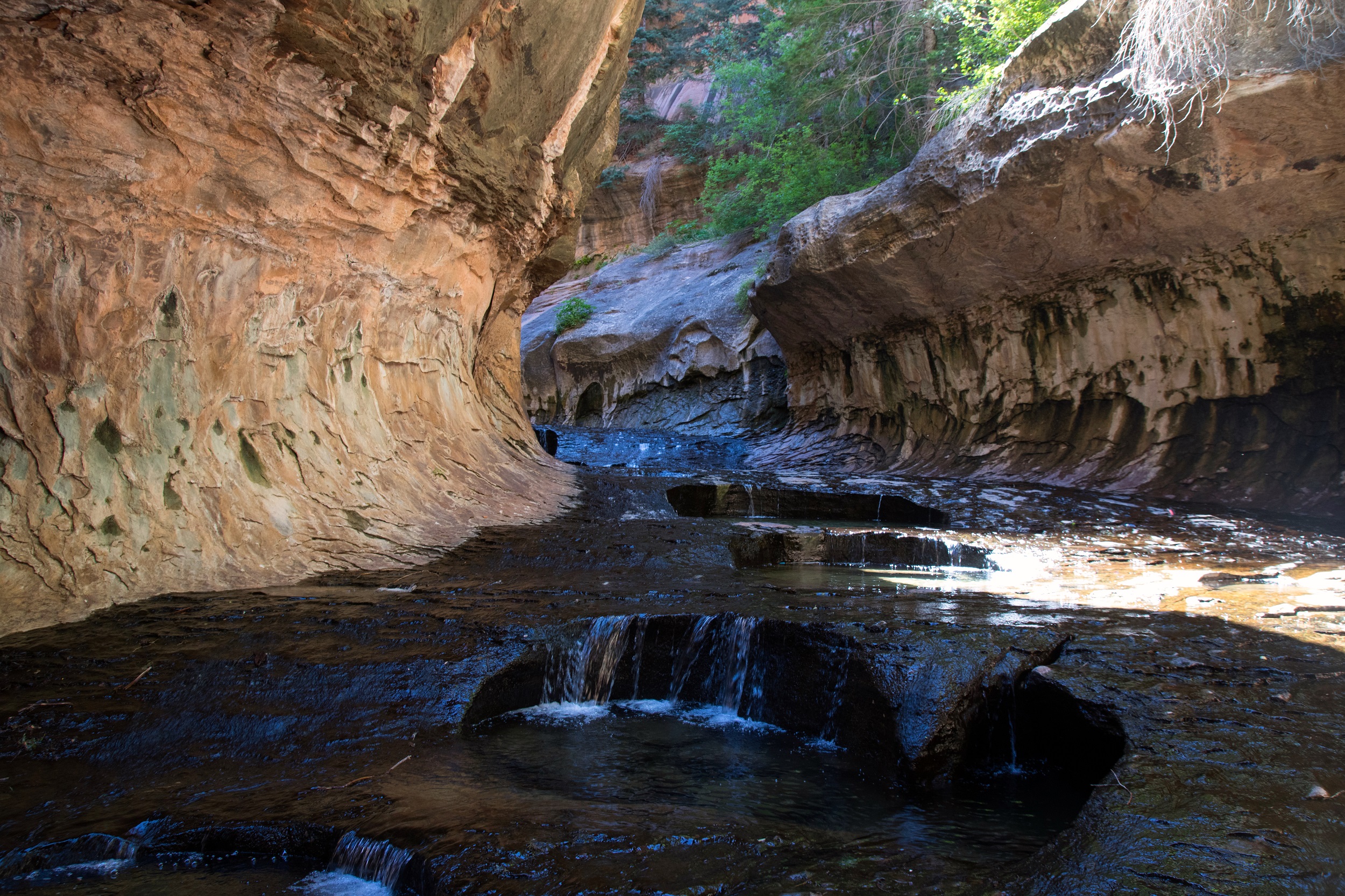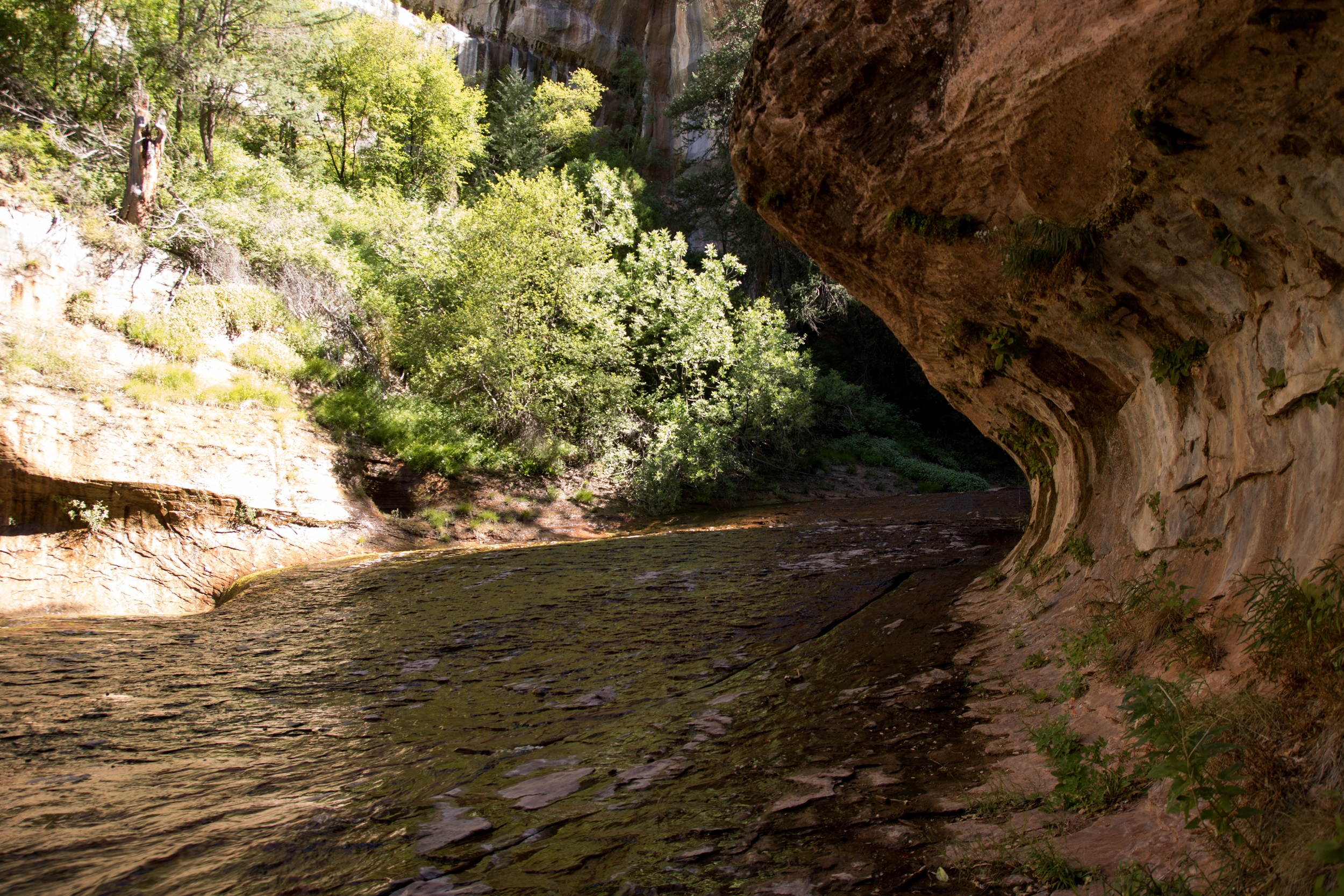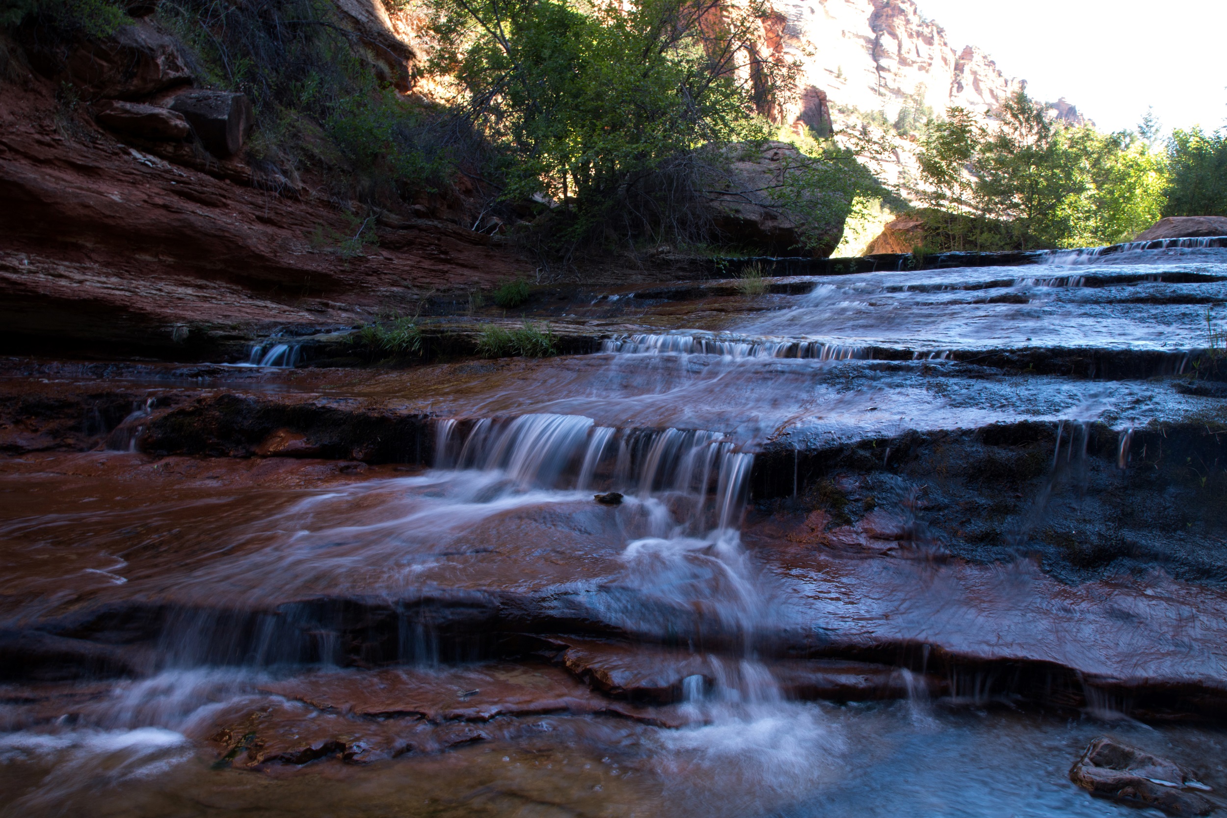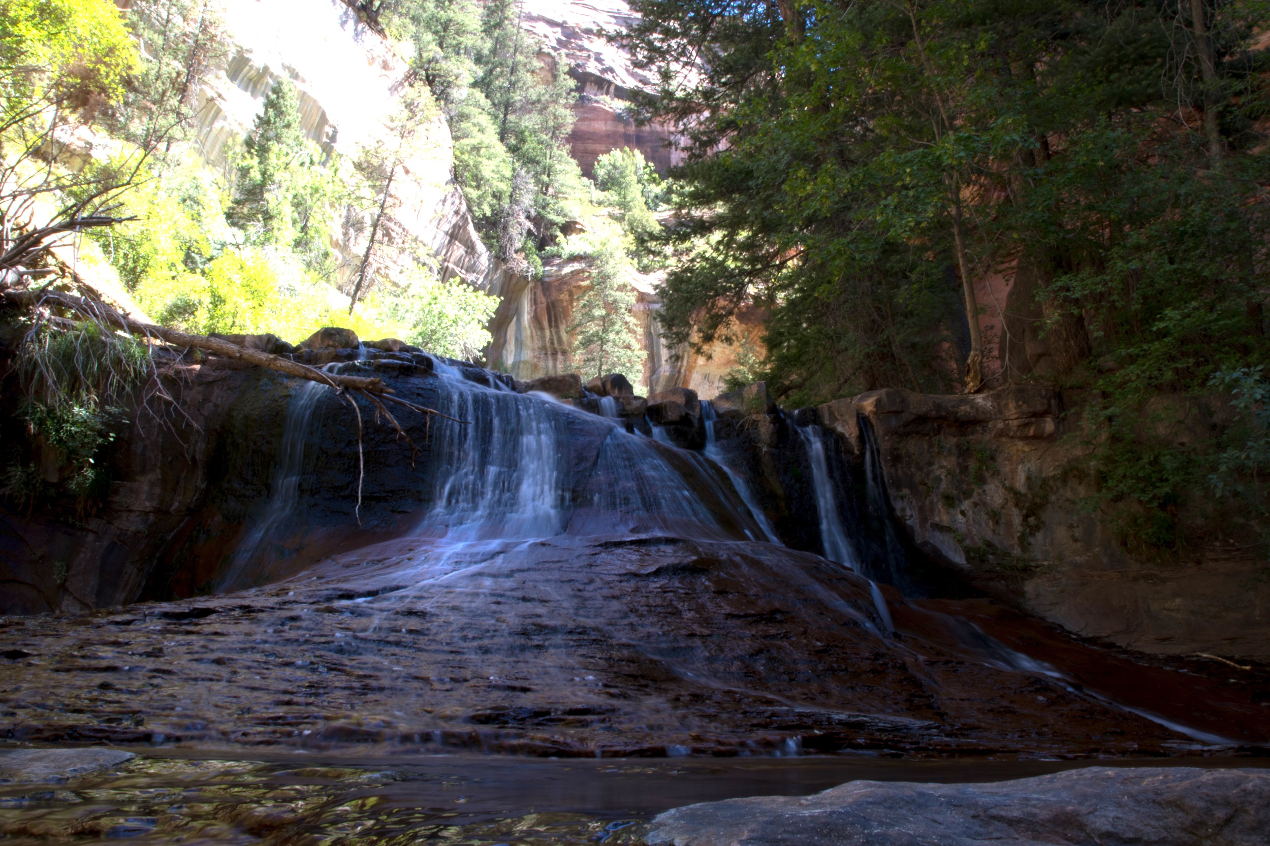 Le lit de la Left Forkof North Creek s’élargit à mesure que le soleil grimpe dans le ciel. Les falaises prennent des couleurs plus vives accentuées par un fond bleu sans nuage. Bientôt, le sable disparait et l’eau file directement sur la roche. Nous voilà donc les pieds dans la rivière, le chemin ayant complètement disparu. De petites cascades apparaissent finalement, marquant un réel tournant dans la balade. Les arbres prennent de la hauteur, la roche s’arrondit, le canyon devient subitement plus étroit.
