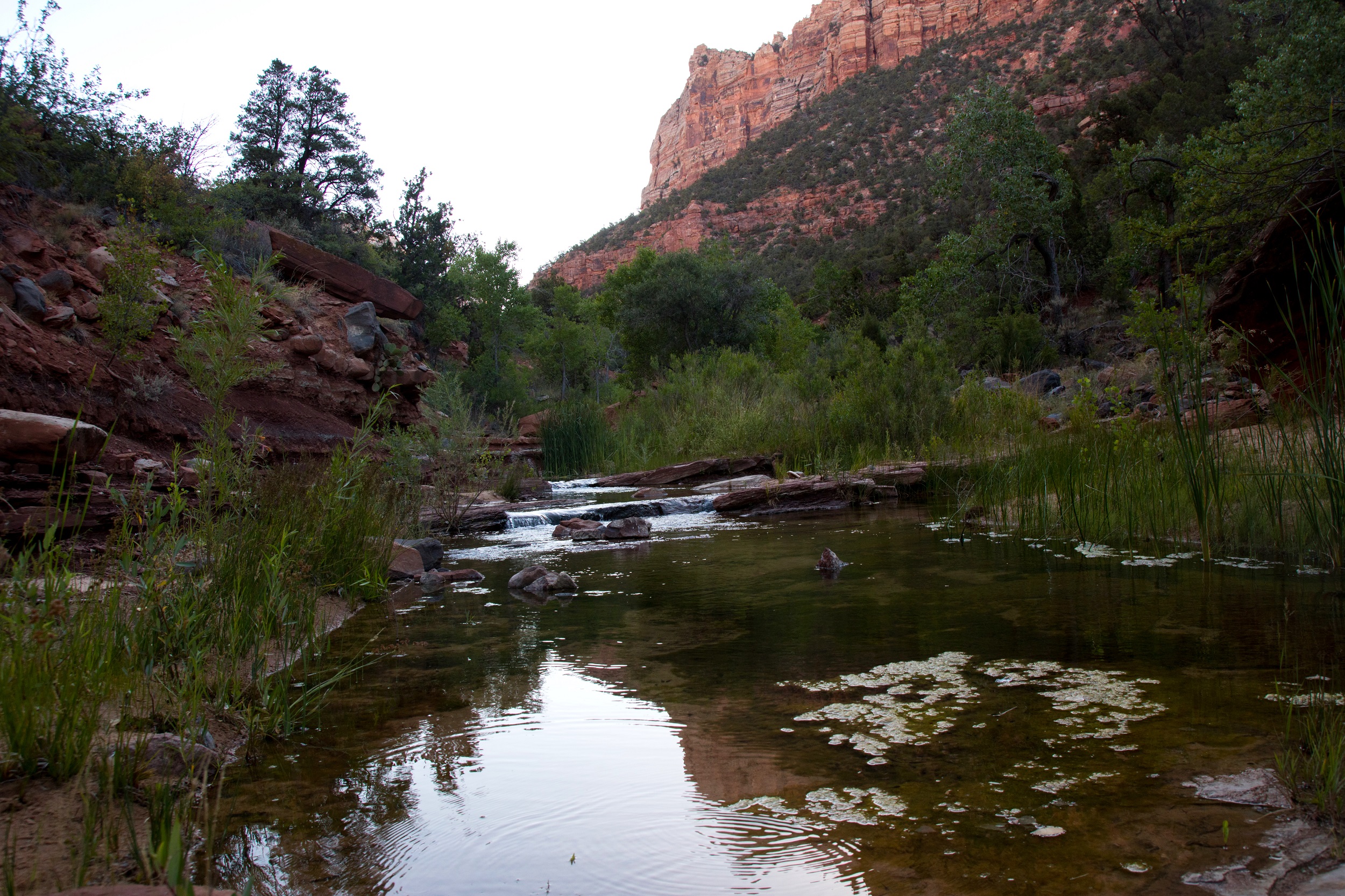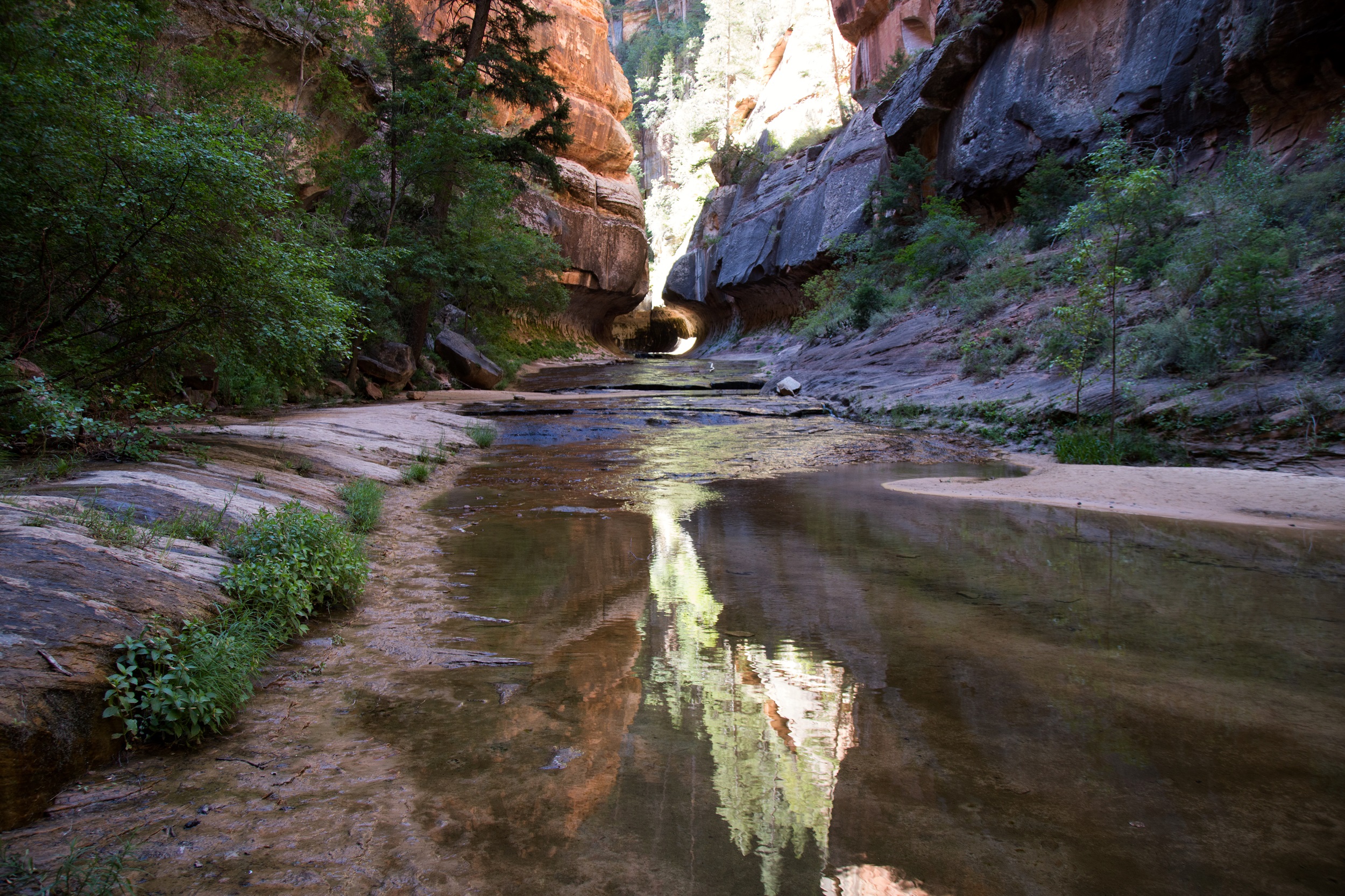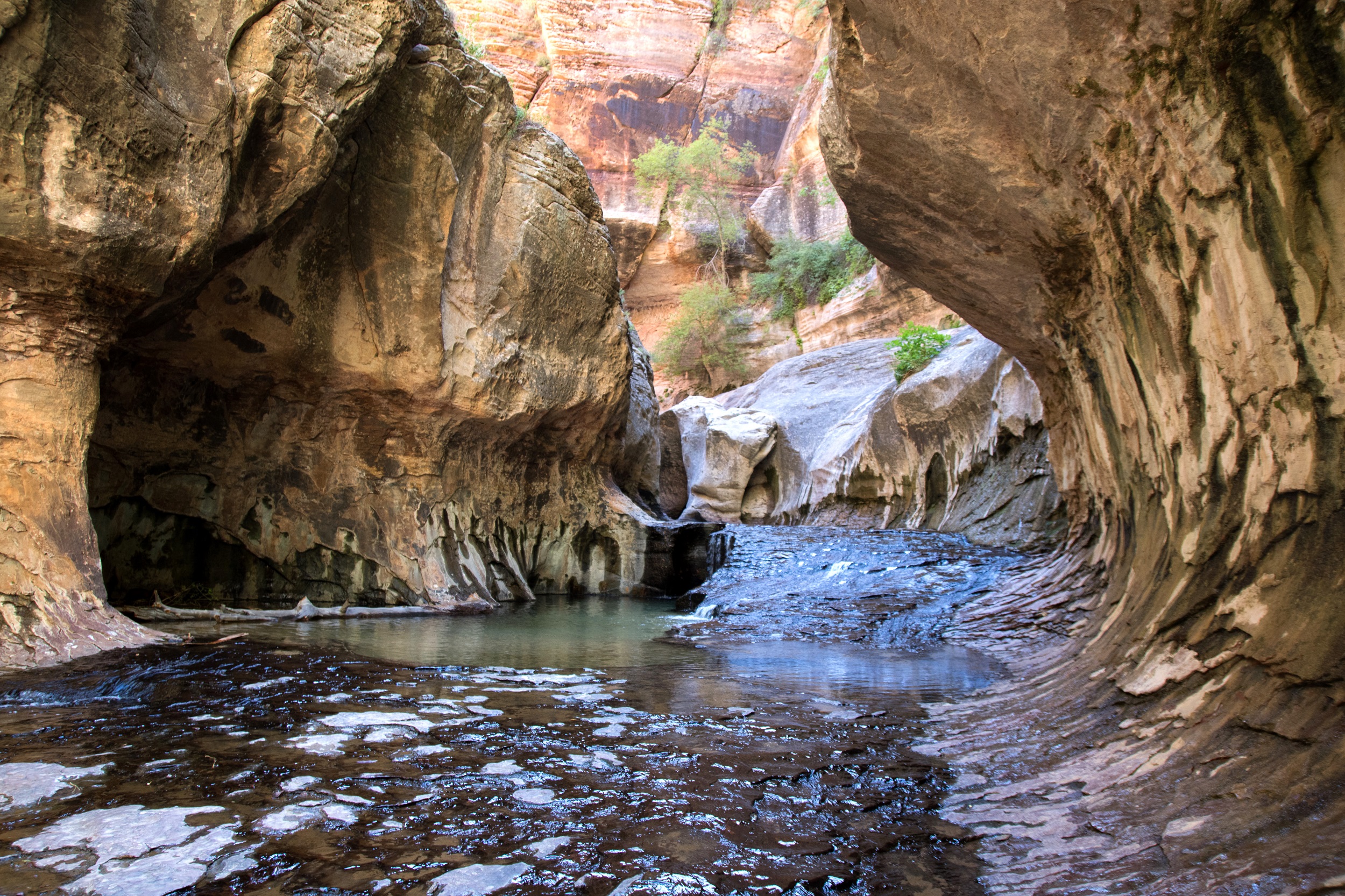 Le lit de la Left Forkof North Creek s’élargit à mesure que le soleil grimpe dans le ciel. Les falaises prennent des couleurs plus vives accentuées par un fond bleu sans nuage. Bientôt, le sable disparait et l’eau file directement sur la roche. Nous voilà donc les pieds dans la rivière, le chemin ayant complètement disparu. De petites cascades apparaissent finalement, marquant un réel tournant dans la balade. Les arbres prennent de la hauteur, la roche s’arrondit, le canyon devient subitement plus étroit.
