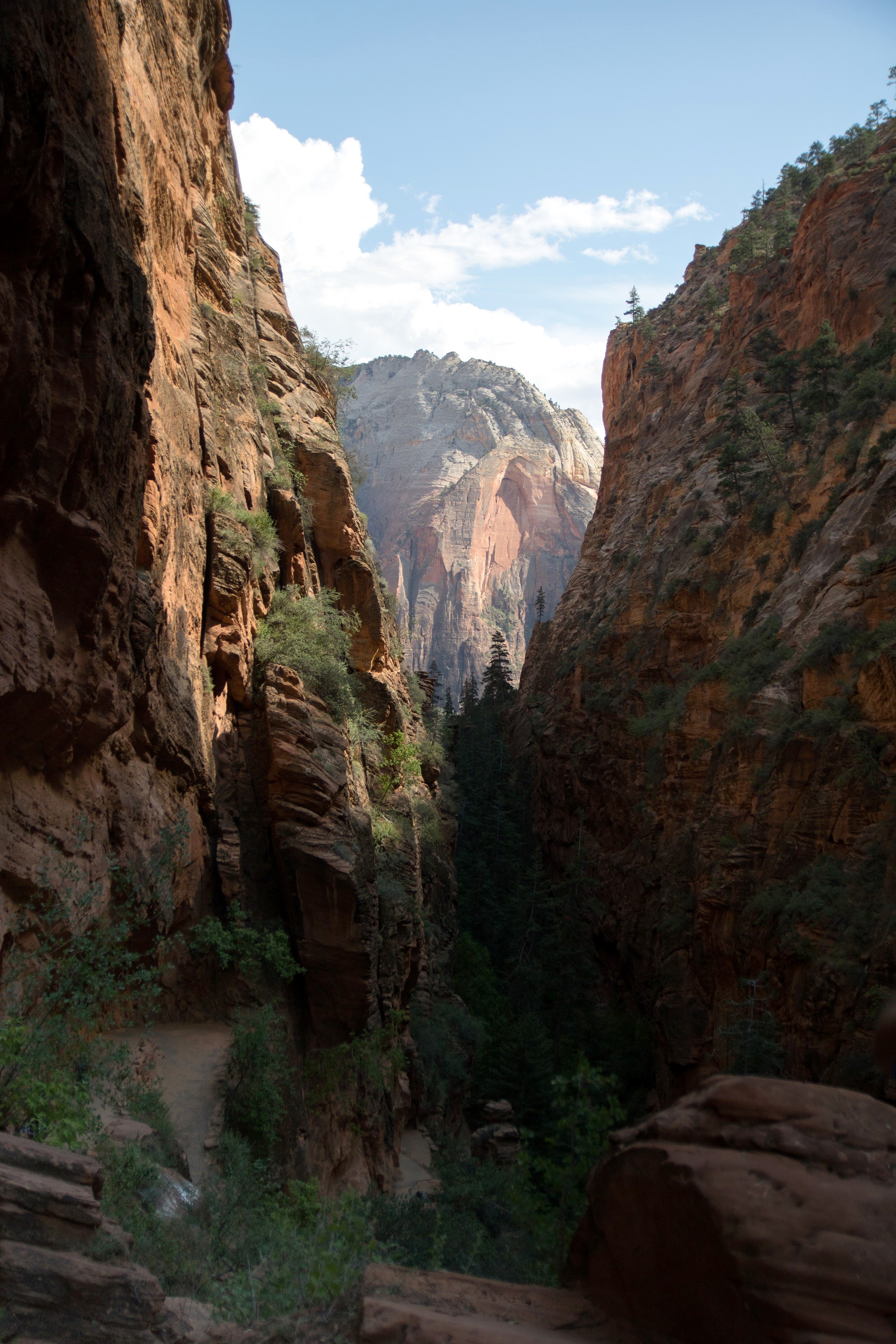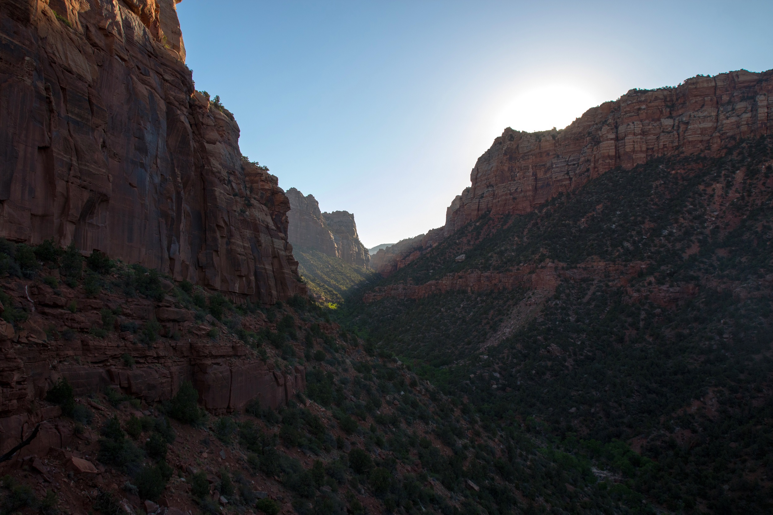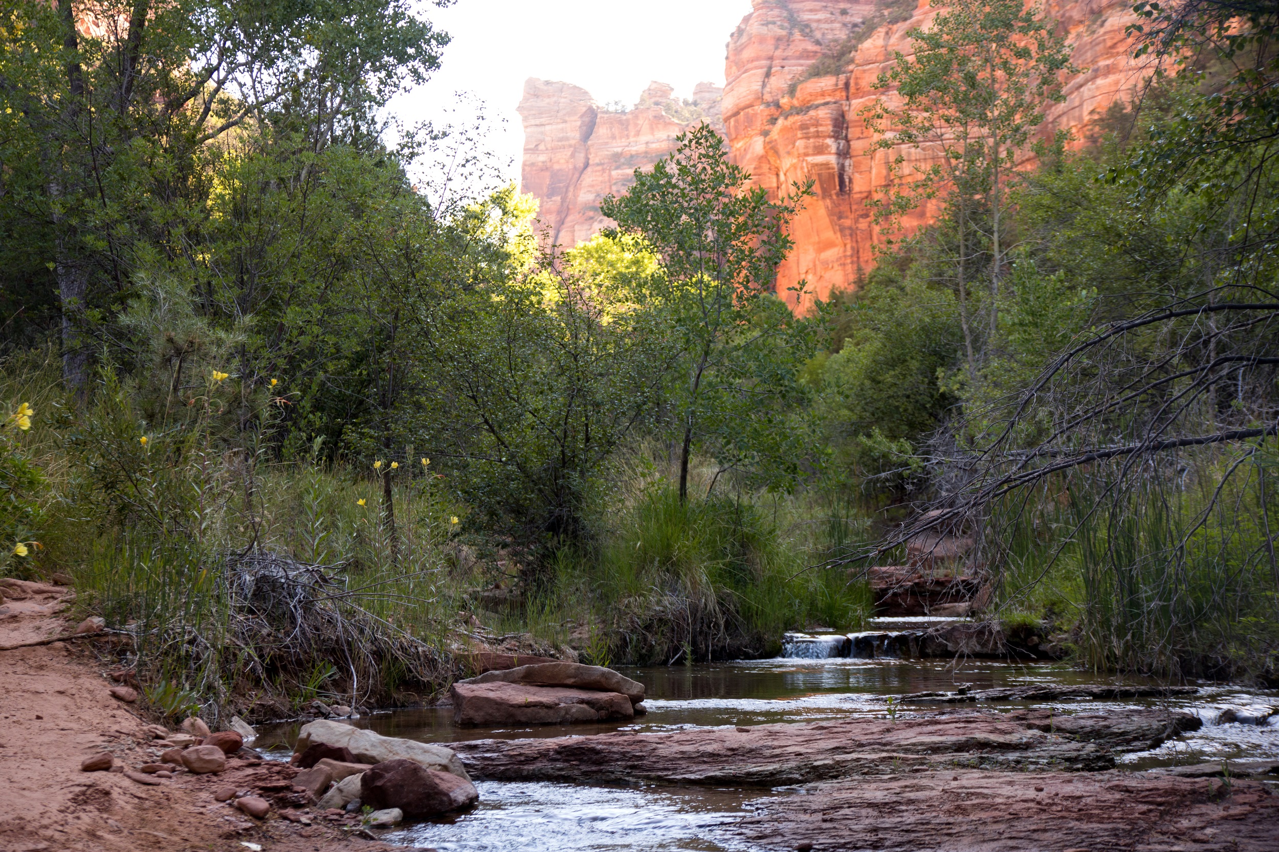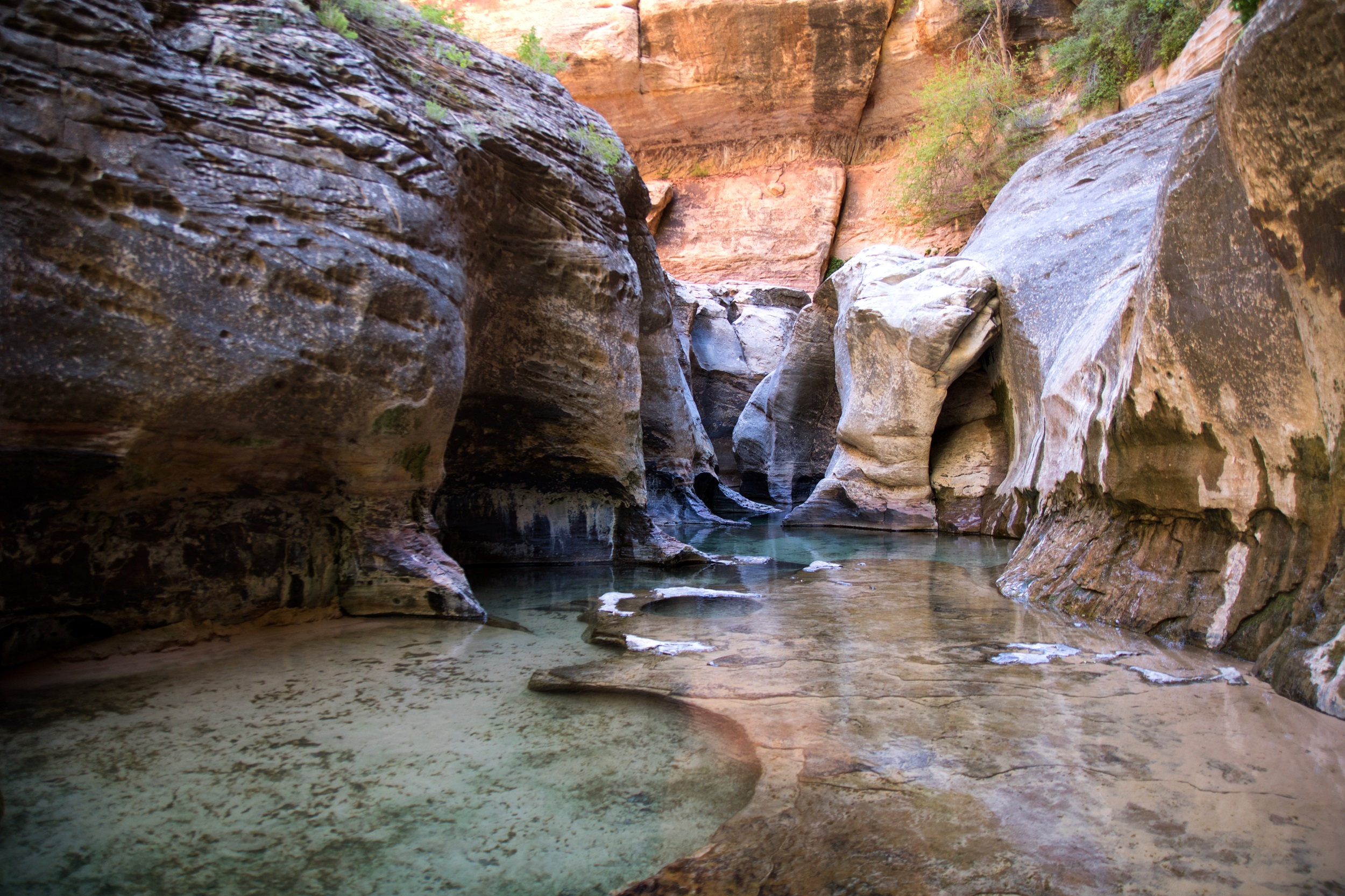 Le lit de la Left Forkof North Creek s’élargit à mesure que le soleil grimpe dans le ciel. Les falaises prennent des couleurs plus vives accentuées par un fond bleu sans nuage. Bientôt, le sable disparait et l’eau file directement sur la roche. Nous voilà donc les pieds dans la rivière, le chemin ayant complètement disparu. De petites cascades apparaissent finalement, marquant un réel tournant dans la balade. Les arbres prennent de la hauteur, la roche s’arrondit, le canyon devient subitement plus étroit.