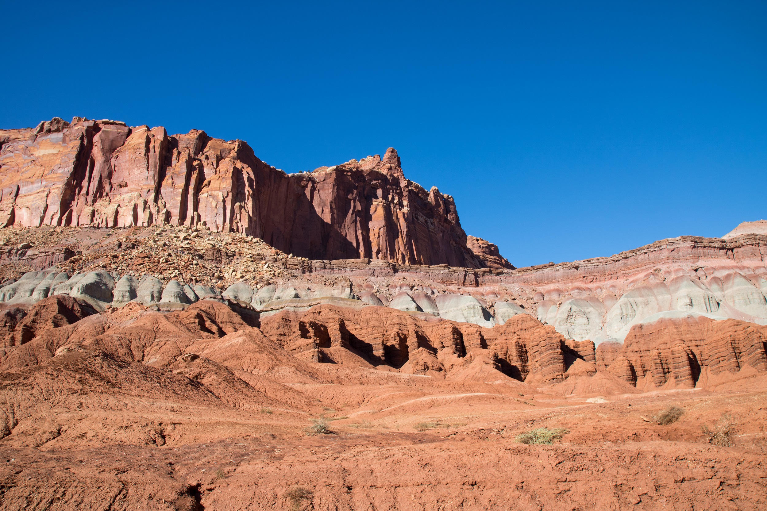 La balade serpente doucement le long des falaises, dans un silence reposant. Rapidement, le chemin devient plus raide et l’on aperçoit finalement, en contre bas d’un champ de pierre particulièrement abrupt, quelques randonneurs. Avec prudence, nous suivons cet improbable circuit, les jambes bientôt pleine d’une poussière rosée. Ce n’est qu’une fois arrivés en bas, indemnes, que l’on commence à s’inquiéter du retour. Ces pensées sont cependant vite balayées par le décor, charmant et tranquille.