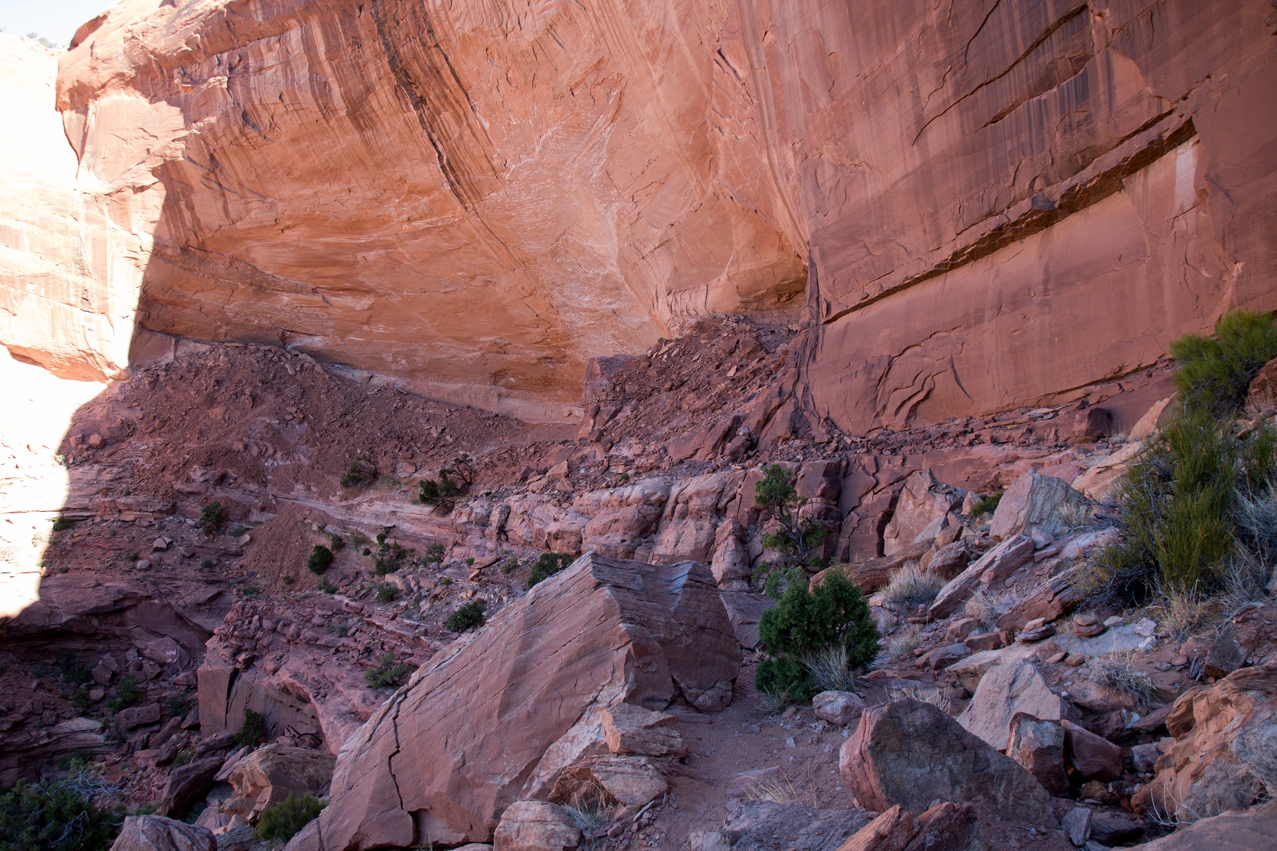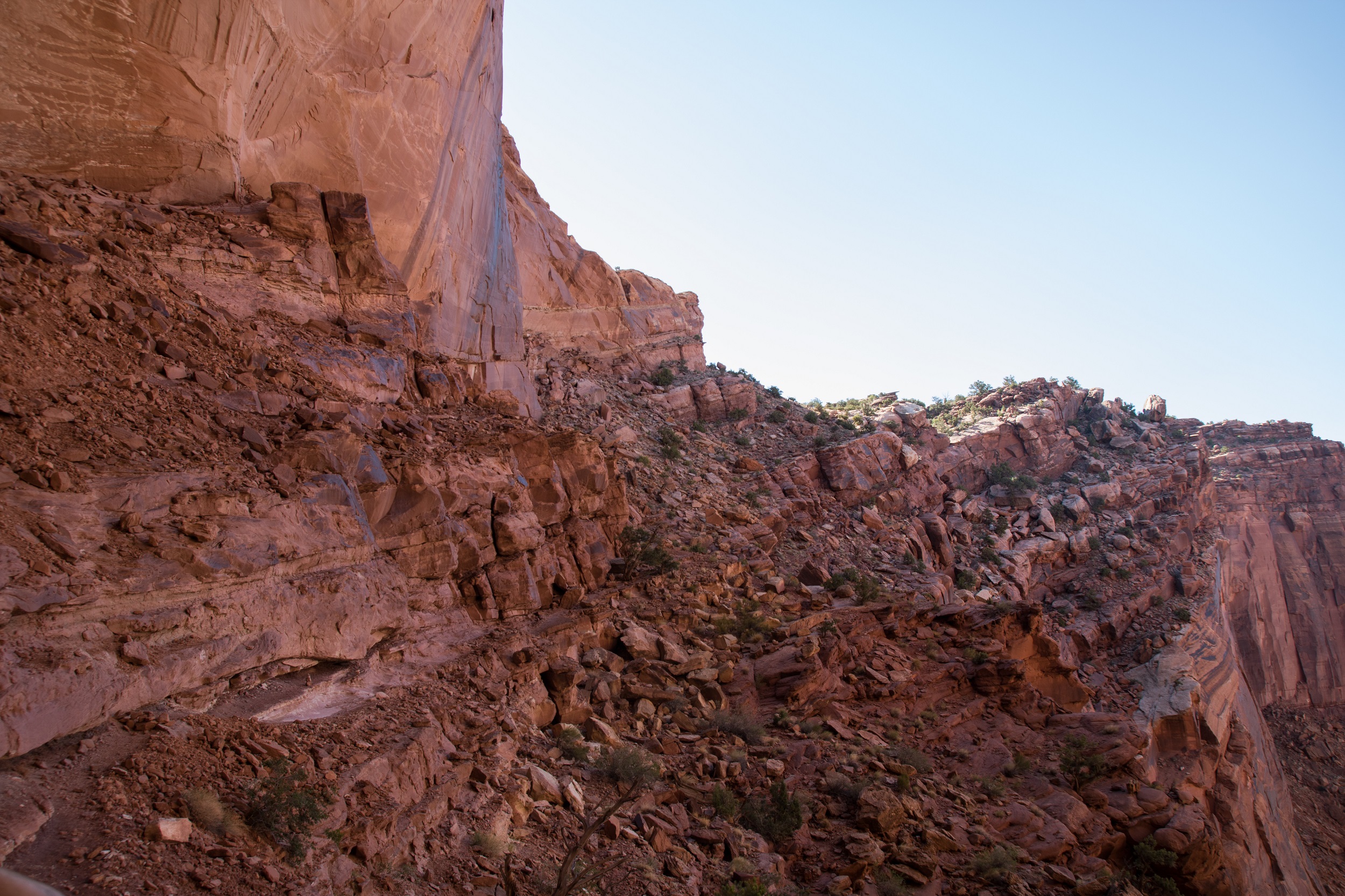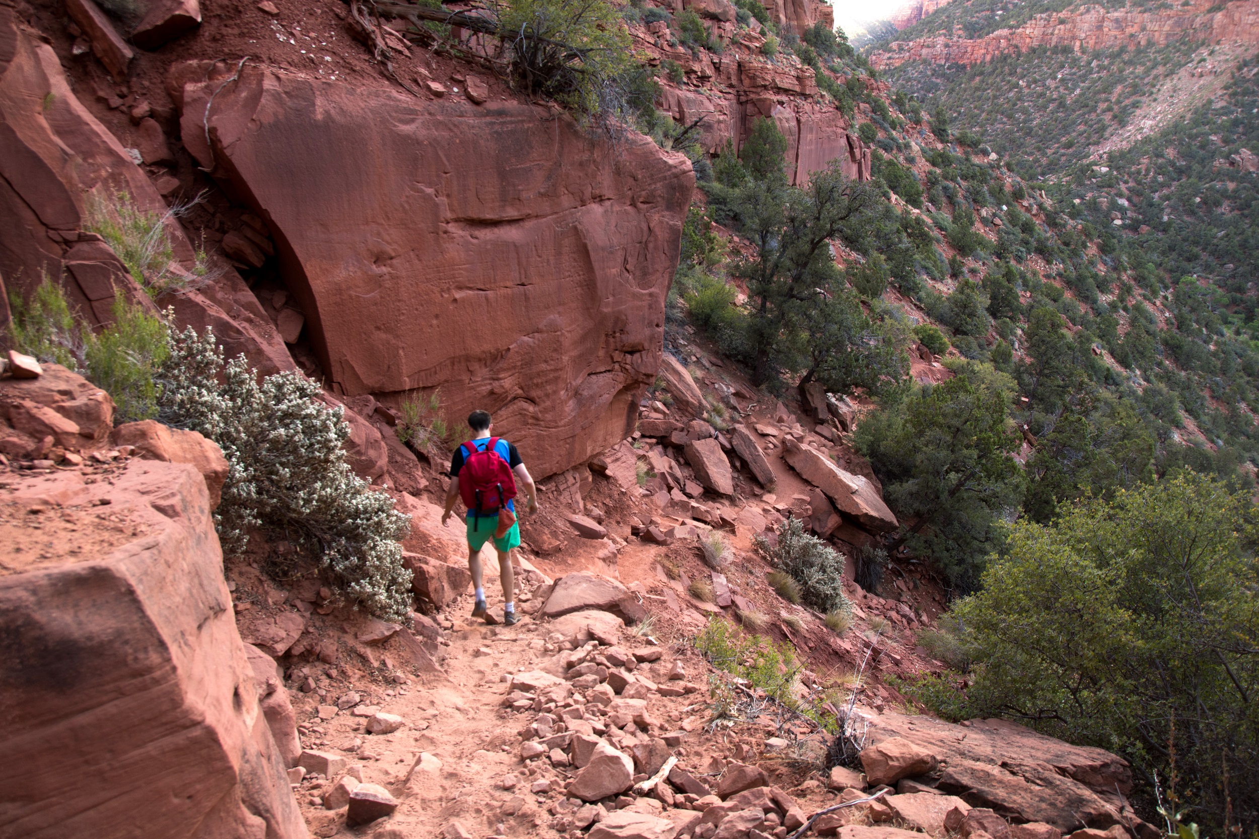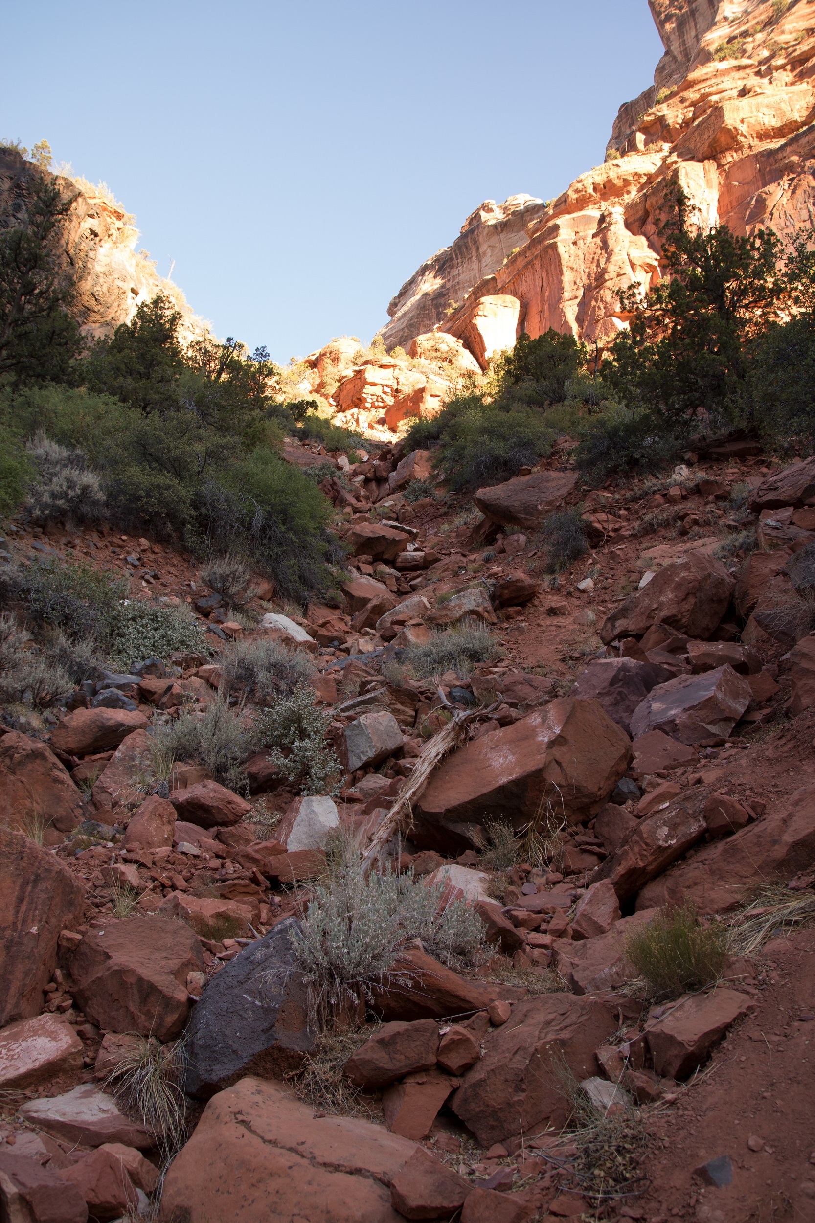 Notre bonne étoile brille toujours au dessus de nos têtes et nous garantit une météo sans risques orageux. Une longue randonnée nous attend et le thermomètre, en revanche, a vite tendance à s’emballer ces jours ci. Le soleil est donc à peine levé quand nous prenons la route, permis en poche, sac à dos chargés et impatients de dévaler le sentier. L’itinéraire du Subway étant peu balisé, on sort le GPS et la trace téléchargée la veille, trace qui nous entraine sur un chemin plein de sable jonché de roches noires. On suit bêtement ce chemin improvisé jusqu’au bord du canyon. Sous nos pieds, le vide: une falaise abrupte et pas la moindre trace de piste. On hésite mais il nous faut finalement faire demi tour et tourner en rond un moment pour retrouver le bon chemin.