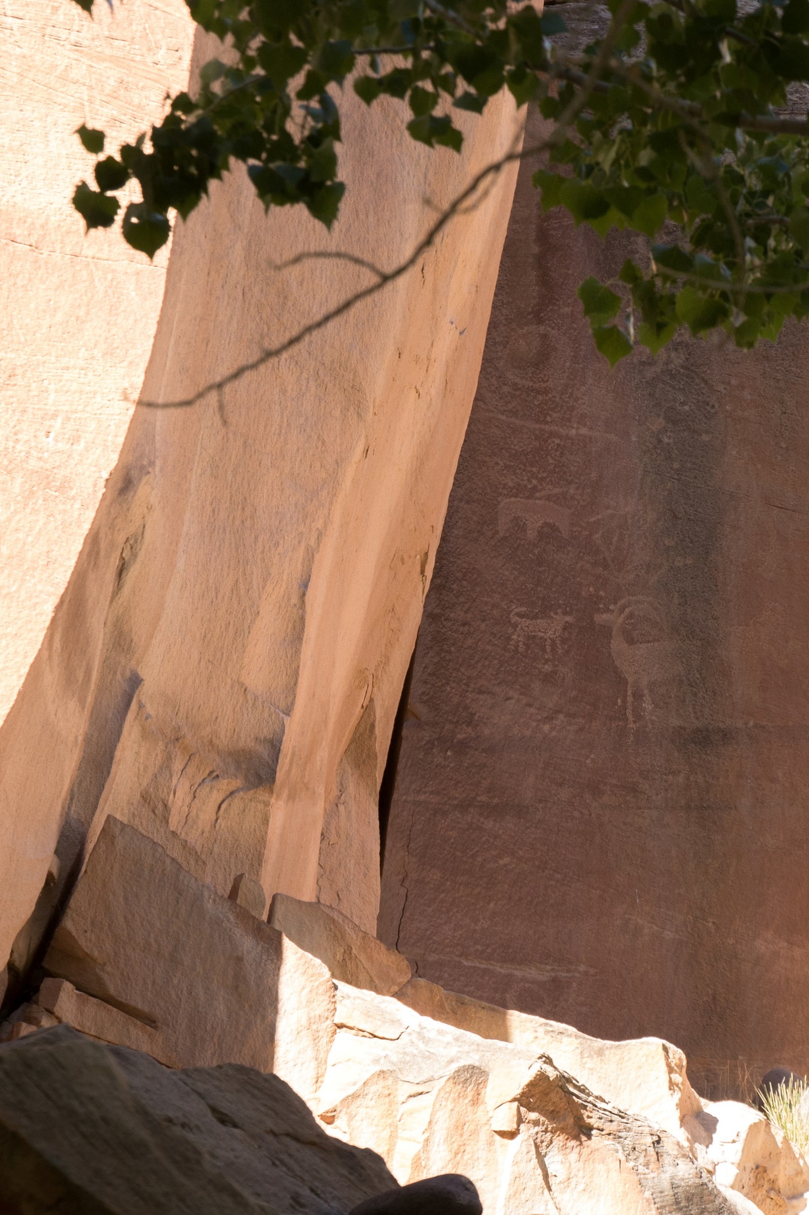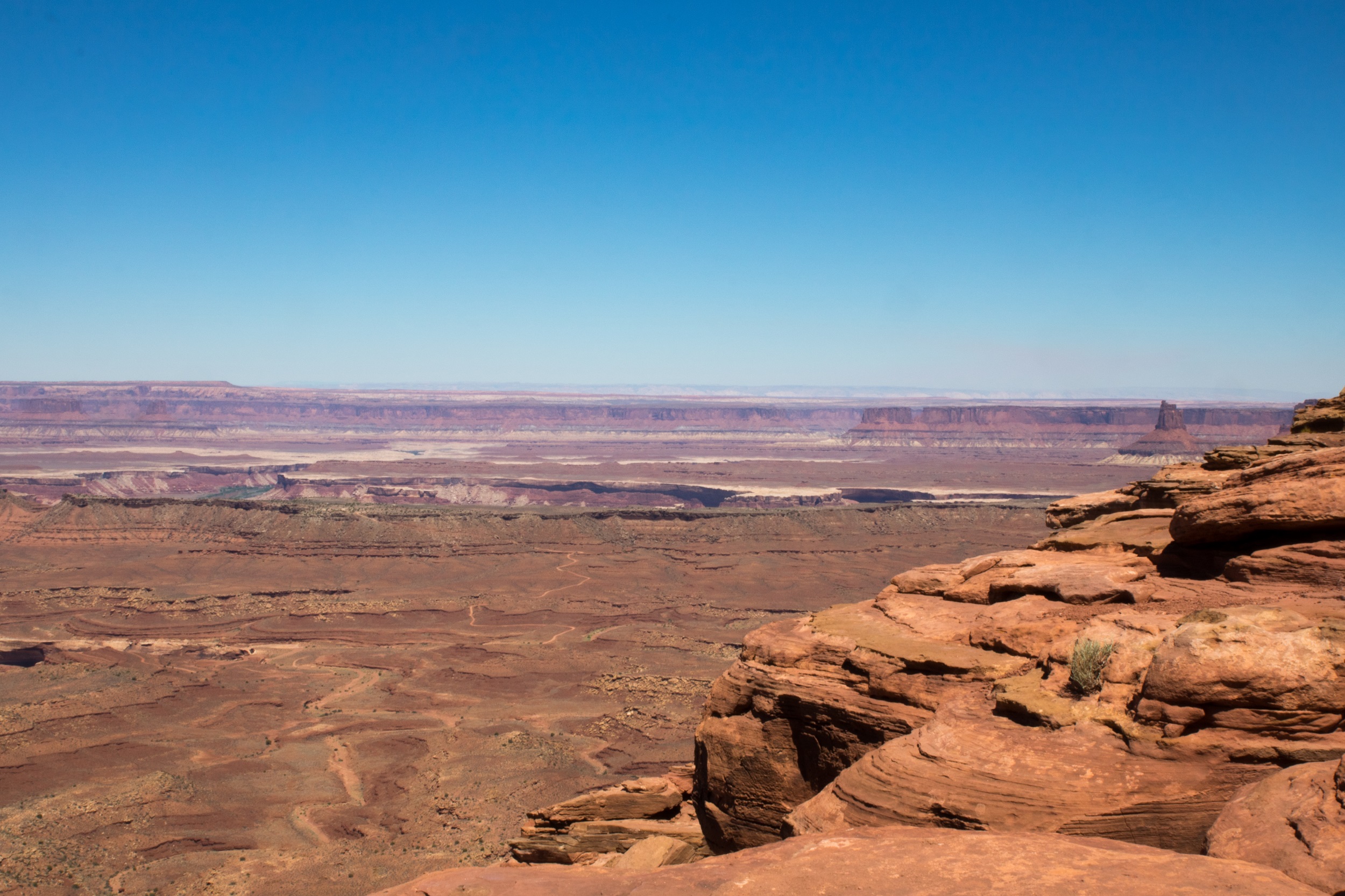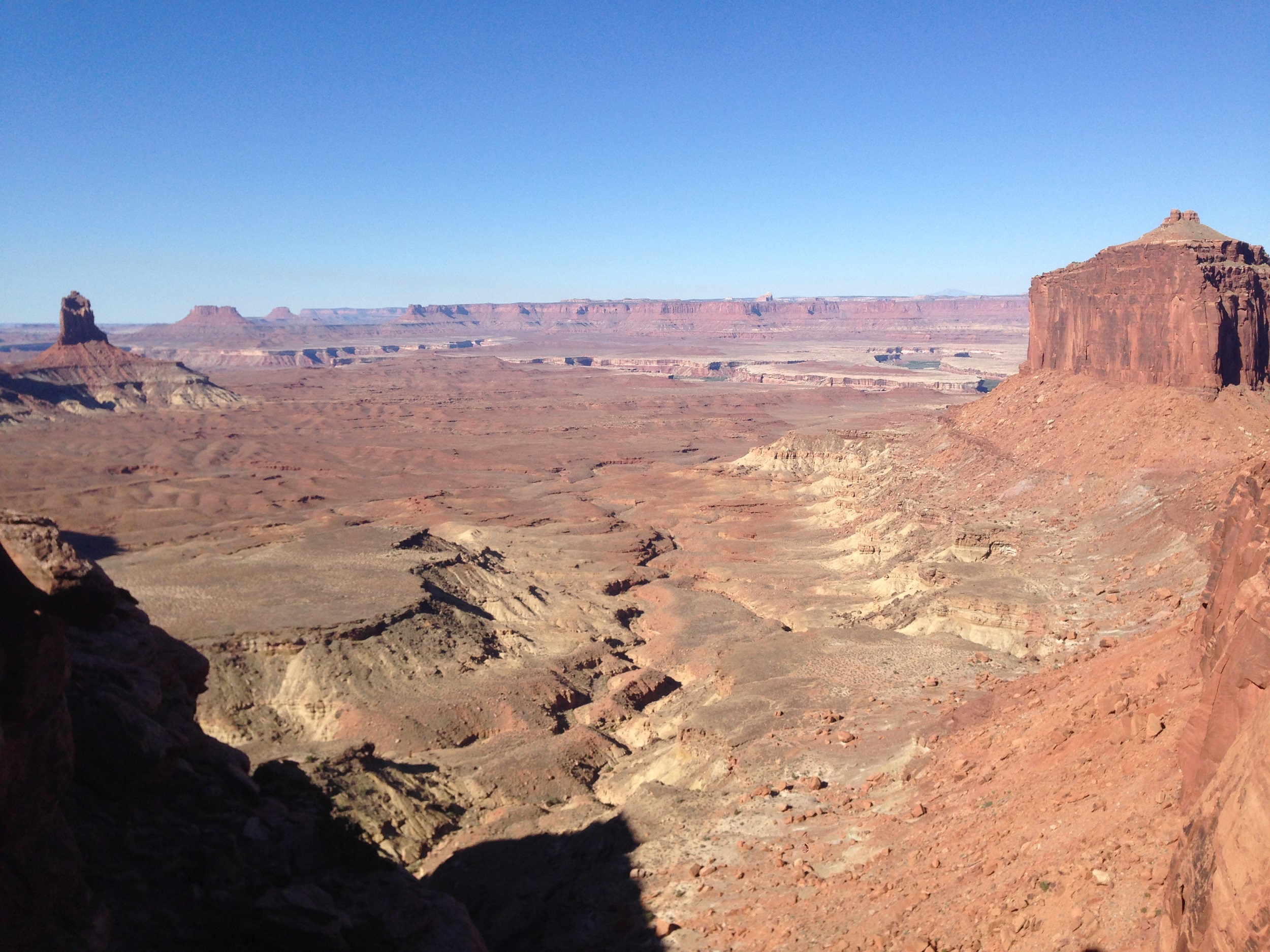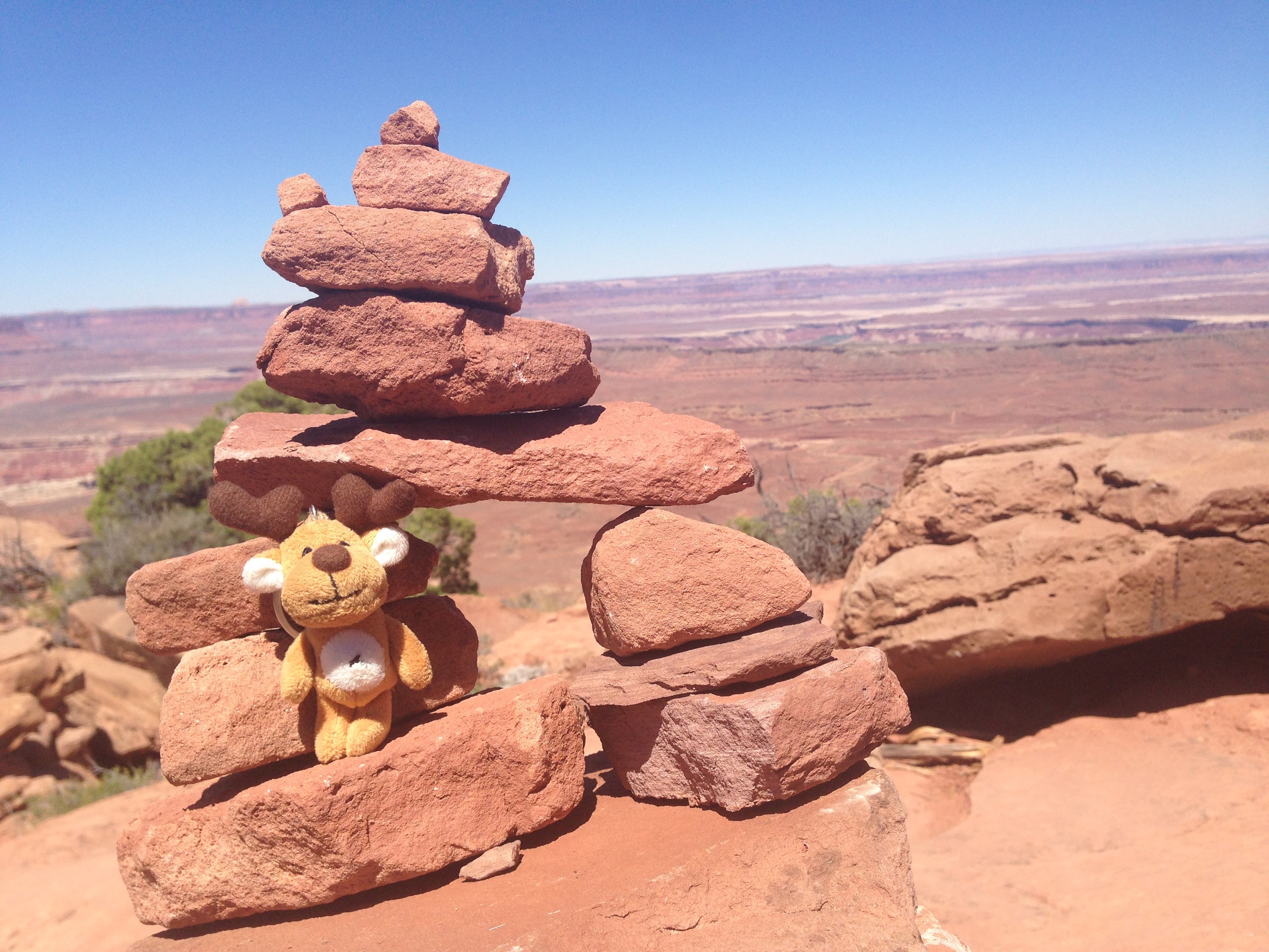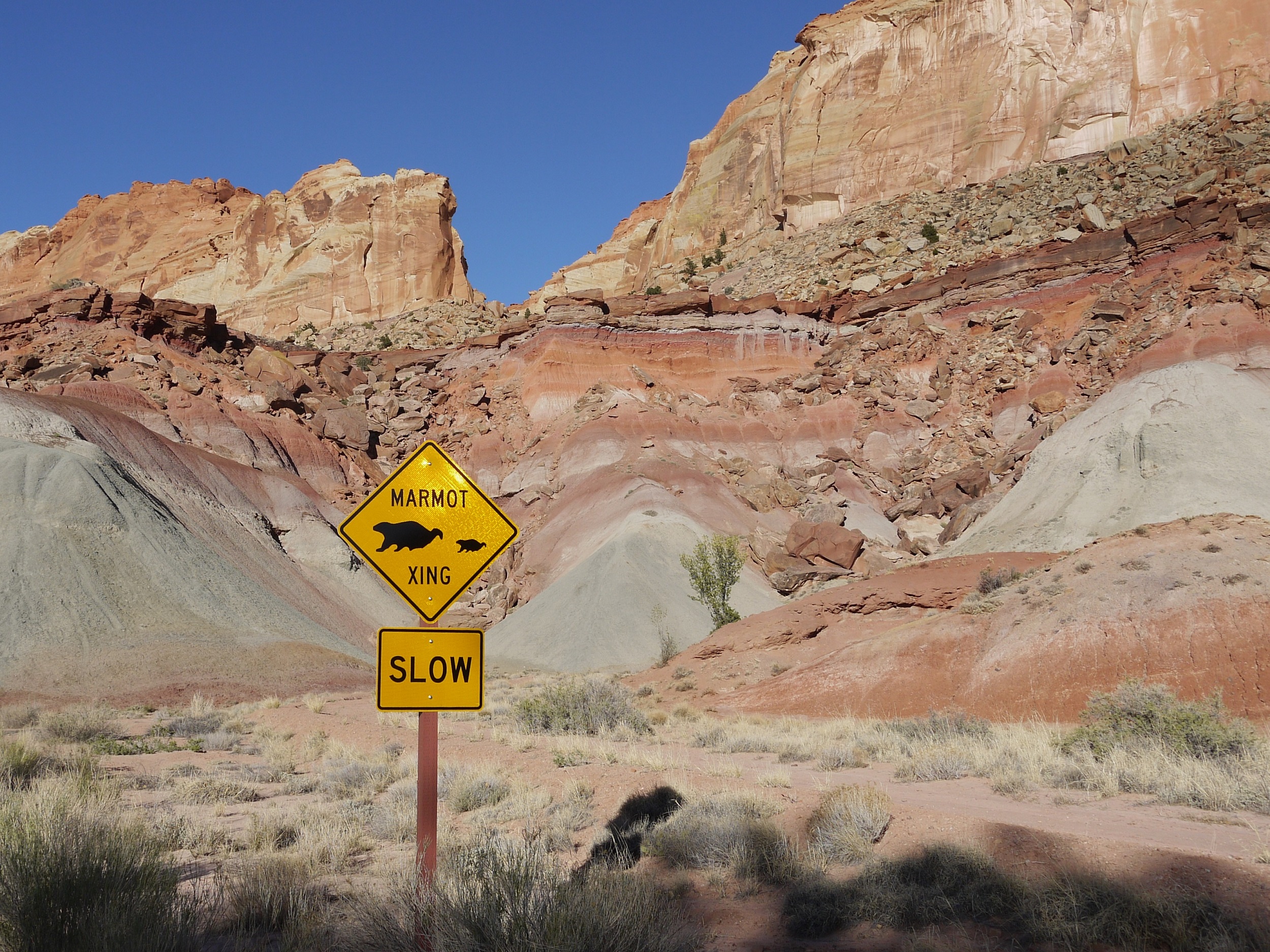 Notre bonne étoile brille toujours au dessus de nos têtes et nous garantit une météo sans risques orageux. Une longue randonnée nous attend et le thermomètre, en revanche, a vite tendance à s’emballer ces jours ci. Le soleil est donc à peine levé quand nous prenons la route, permis en poche, sac à dos chargés et impatients de dévaler le sentier. L’itinéraire du Subway étant peu balisé, on sort le GPS et la trace téléchargée la veille, trace qui nous entraine sur un chemin plein de sable jonché de roches noires. On suit bêtement ce chemin improvisé jusqu’au bord du canyon. Sous nos pieds, le vide: une falaise abrupte et pas la moindre trace de piste. On hésite mais il nous faut finalement faire demi tour et tourner en rond un moment pour retrouver le bon chemin.