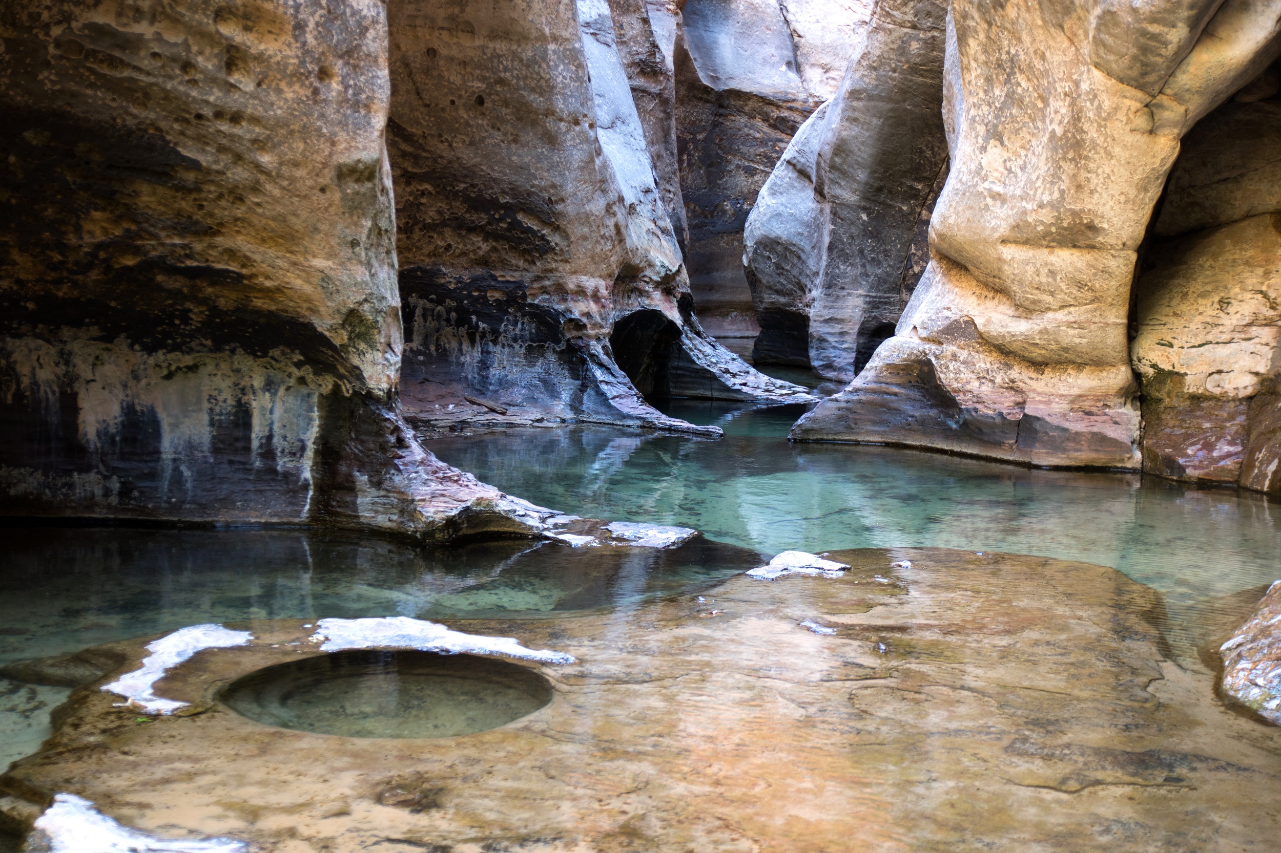 On avance le nez en l’air, tout petits au pied de ces falaises qui se rapprochent toujours plus. Un virage, un autre et, enfin, on aperçoit les rondeurs du Subway. Les lumières du canyon se reflètent dans l’eau presque stagnante devant l’entrée des lieux et la douce euphorie de la loterie gagne à nouveau les troupes. Il n’existe sans doute pas, à cet instant, de randonneurs plus privilégiés que nous, seuls devant une merveille que peu on la chance de découvrir.