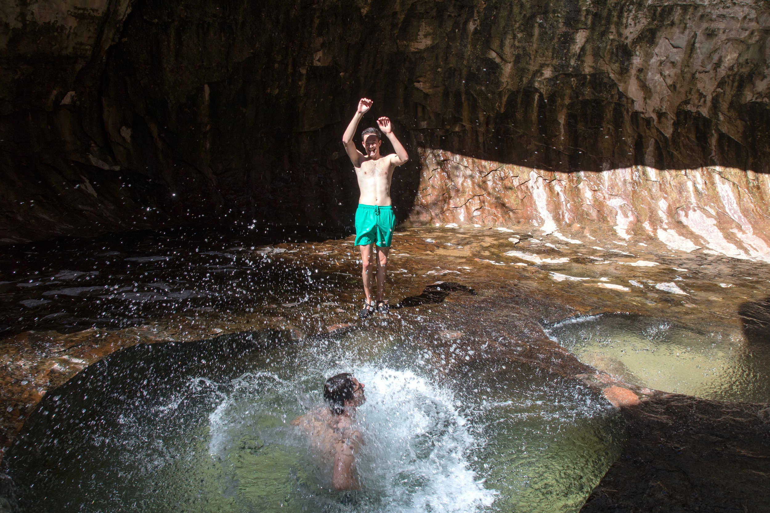 On s’avance tout doucement vers l’entrée du tunnel, avançant à pas de loup sur la roche polie par les années. Les parois du Subway cache une succession de piscines naturelles à l’eau bleutée translucide. Le chemin s’arrête ici, dans ce décor incroyable baigné de soleil. Par curiosité, et sans doute pour prolonger un peu le plaisir de la découverte, on dépose toutes les affaires aussi haut que possible avant de partir à la nage dans le dédale des derniers bassins. Alors que la fraicheur saisit instantanément chaque muscle immergé, on avance en riant bêtement, insensible à ce léger détail. Après quelques virages, une cascade d’eau glacée nous accueille dans le dernier bassin. Les plus courageux se glissent dans une étroite faille entre deux rochers pour se laisse asperger par la Keyhole Falls, dernière étape du voyage.