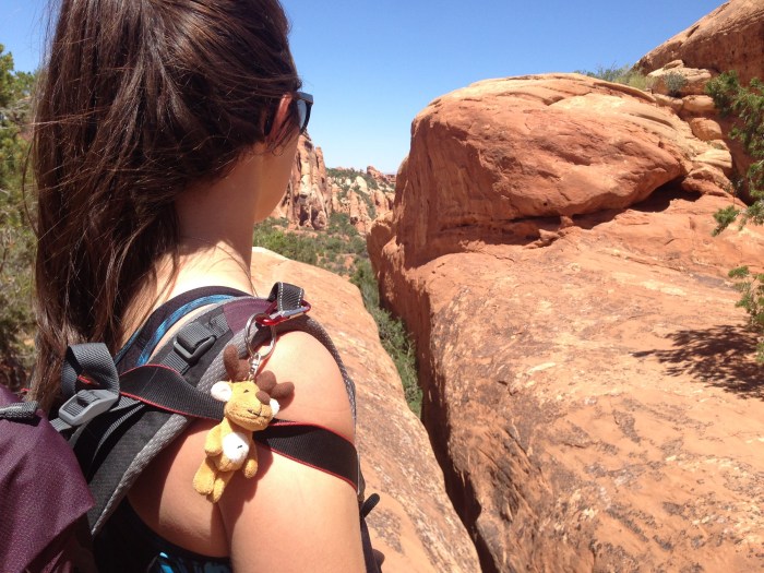 Notre bonne étoile brille toujours au dessus de nos têtes et nous garantit une météo sans risques orageux. Une longue randonnée nous attend et le thermomètre, en revanche, a vite tendance à s’emballer ces jours ci. Le soleil est donc à peine levé quand nous prenons la route, permis en poche, sac à dos chargés et impatients de dévaler le sentier. L’itinéraire du Subway étant peu balisé, on sort le GPS et la trace téléchargée la veille, trace qui nous entraine sur un chemin plein de sable jonché de roches noires. On suit bêtement ce chemin improvisé jusqu’au bord du canyon. Sous nos pieds, le vide: une falaise abrupte et pas la moindre trace de piste. On hésite mais il nous faut finalement faire demi tour et tourner en rond un moment pour retrouver le bon chemin.